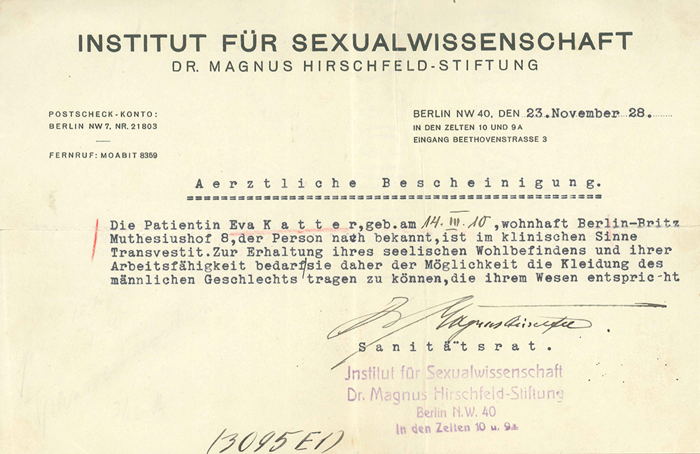 Transvestite pass issued to Gerd Katter on 23 November 28 by the Institut für Sexualwissenschaft